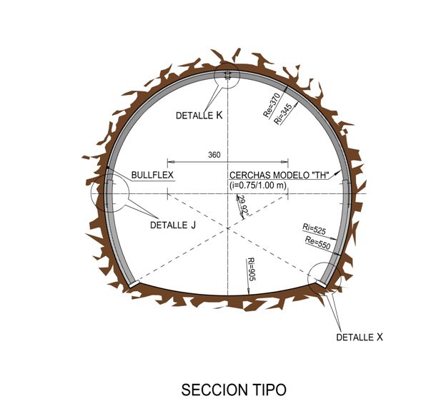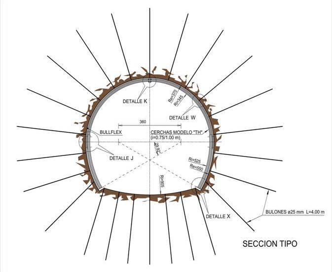 Ha sido necesario contar con metodologías especiales de contención y consolidación. La sección a intervenir contó con la instalación de cerchas, que en algunos tramos fueron instaladas junto con el sistema de bulones radiales.