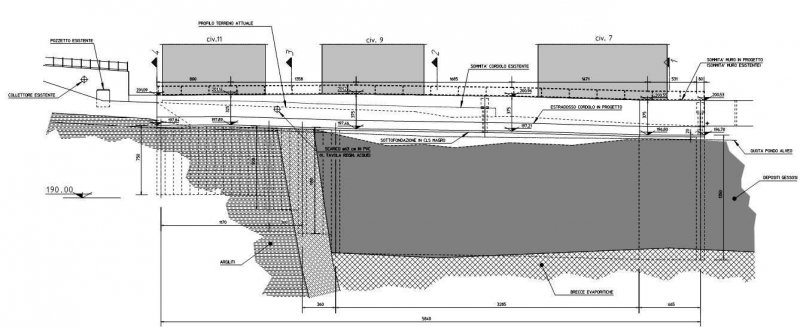 Esta situación de amenaza se generaba por una condición geológica y ambiental muy particular; el terreno de fundación de los edificios en el entorno de la obra estaba caracterizado por la presencia de un estrato de material de relleno y/o sedimentario, compuesto por yeso y que en el pasado fue objeto de extracción en el subterráneo. La cavidad ha sido cultivada mediante una serie de pozos y de corredores subterráneos que atraviesan incluso el lecho del río torrentoso.